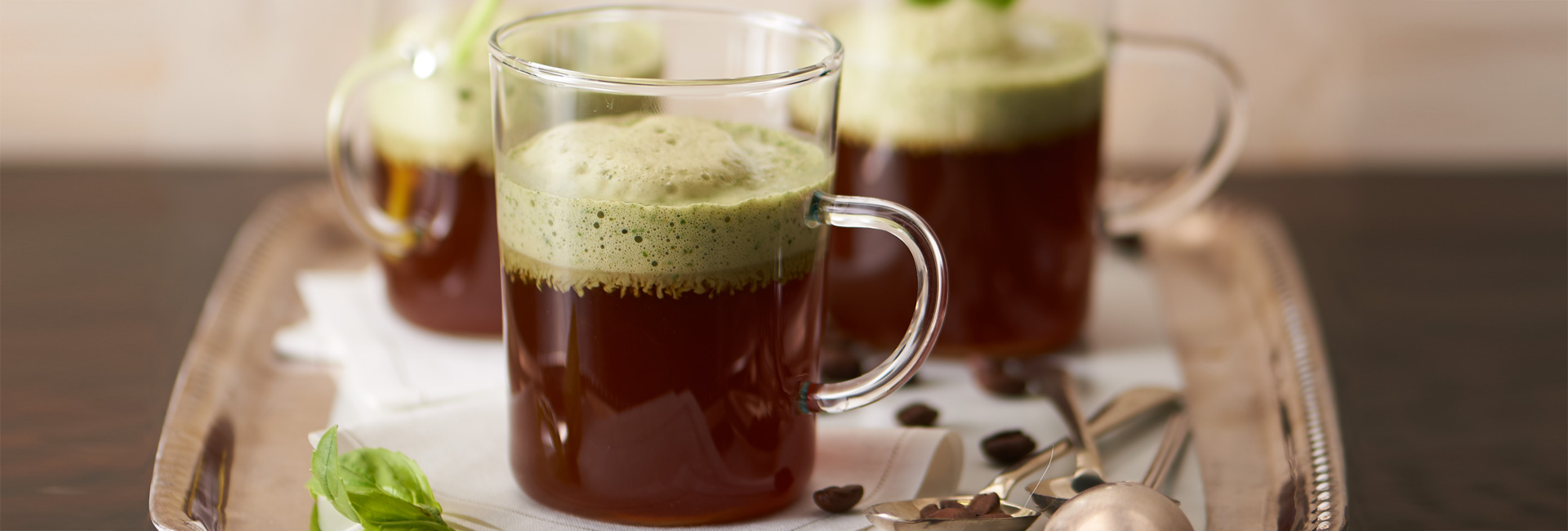 傳統牛肉清湯現已成為火熱的新趨勢!這種用牛骨和蔬菜烹製的肉湯因在烹煮過程中將礦物質、蛋白質和氨基酸釋出成為高湯,因此一直被視為健康食品。我們的祖父母輩都深知其好處。而現在,由於加入了阿拉伯咖啡豆和少許乾身些厘酒、小量東方香料,其上還有羅勒奶泡,這種清湯已經成為一種提神醒腦的能量飲料。