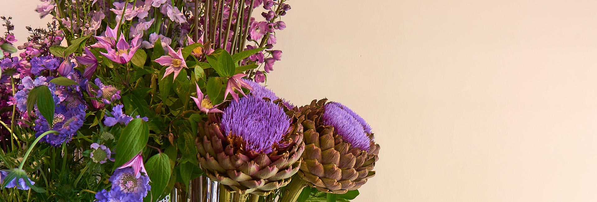 「在你的家中,越少越美,不應讓人感到誇張。」一般在碟子上擺放幾枝旱金蓮或倒掛金鐘,又或用數枝迷迭香裝飾一下桌面已經足夠。但必須與你端上的菜色相配!在壽司店看到的粉紅色蘭花與燉肉實在不配襯。但我認為與桌子本身相比,桌子週圍的空間更加重要。如果要令鮮花成為主題的一部分,則可以誇張一些,例如為慶祝春天到來將鮮花鋪滿桌面。
