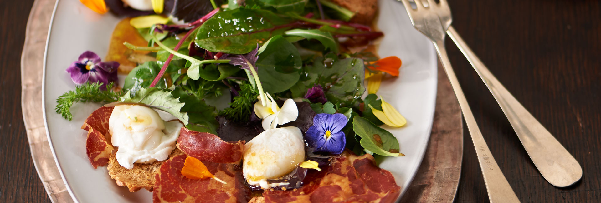 這款清淡的春天時蔬沙律配意式谷巴風乾煙肉、脆麵包粒,再淋上與別不同但美味可口的油醋,後者以凍咖啡、蘋果汁和蜂蜜芥末調製而成,清新可喜。雜錦菜葉綴以水煮鵪鶉蛋,賣相極為吸引。