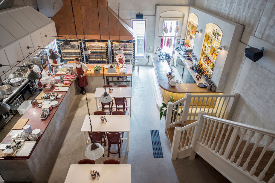 他的鄰居是Kensington Street社交餐廳的英國米芝蓮星級主廚Jason Atherton(倫敦的Pollen Street Social 及 City Social)。這座在工業遺產名錄榜上有名的建築內,天花便有十米高,客人可以在開放式廚房觀看廚師烹飪。他們製作美味佳餚,例如,昆士蘭旭蟹配冷凍青瓜湯和大黃,或者烤黑毛豬排配甜心菜和蘿蔔。